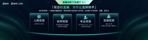低門檻方面,充分聯動行業資源,提供模型零元購、硬件設備租賃、短視頻代制作及一站式解決方案;高讓利方面,最大程度地分享平臺資源,提供超高返點和持續保障;強服務方面,提供托管服務、培訓服務、主題活動、當天響應服務,幫助虛擬主播快速適應快手生態。