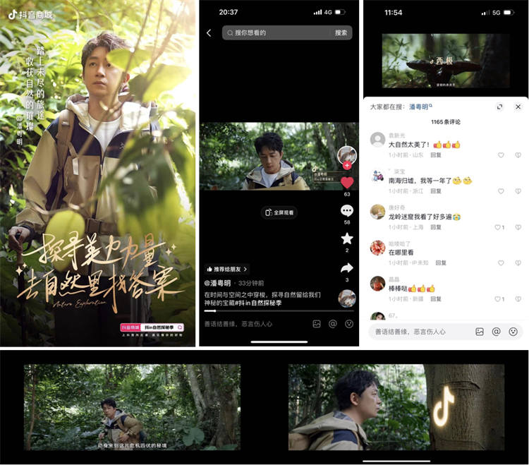 在活動先導短片上線的同期階段,平臺側一并搭建#抖in自然探秘季#話題頁,該話題頁下蕓聚潘粵明、陳意涵,王鶴潤等明星藝人的打call視頻,播散活動主旨,最大范圍內聚集藝人影響力,為活動引流造勢,提升IP熱度。