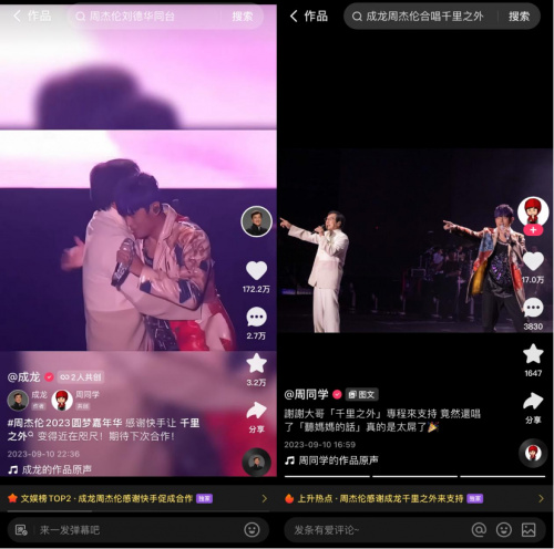 演唱會結束后,成龍與周杰倫先后在其快手賬號上發布了共創視頻,共同記錄下這難忘的一夜。周同學表示“謝謝大哥「千里之外」專程來支持,竟然還唱了《聽媽媽的話》,真的是太厲害了”,而對登臺演唱意猶未盡的成龍則寫道“感謝快手讓千里之外變得近在遲尺,期待下次合作”。
