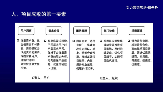 結合自己目前有限的經驗,從5個視角對“人”做了梳理。分別是用戶洞察、需求分層、團隊管理、部門協作、渠道拓建。用戶洞察、需求分層偏向用戶本身。團隊管理、部門協作、渠道拓建偏向組織層面。