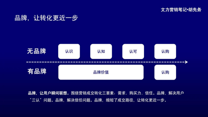 我對品牌的理解,品牌讓用戶瞬間聯想你是誰,做什么的。影響用戶下單購買,3個核心要素:需求、購買力和信任。品牌要解決的正是其中最難的環節,信任。