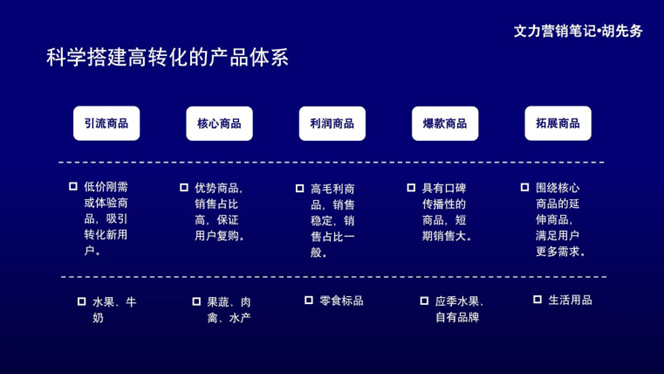 一套完整的產品體系包括引流商品、核心商品、利潤商品、爆款商品和拓展商品。這里拿零售行業舉例,每類商品概念對應做了補充說明。