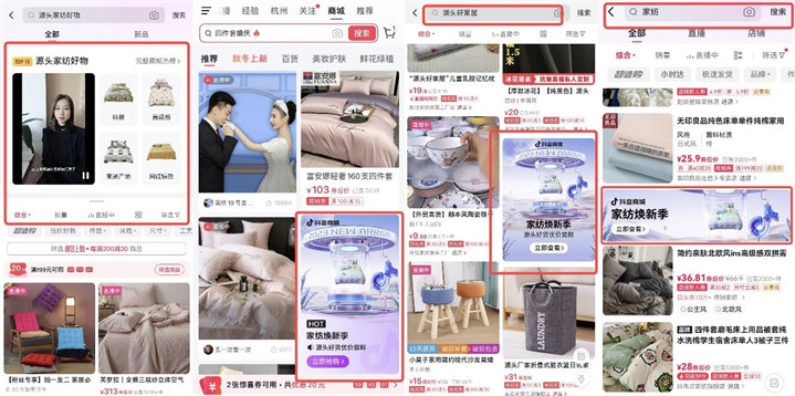 為了更好的承接優質內容帶來的流量熱度,進一步激發活動勢能,「源頭好家居·家紡煥新季」積極布局貨架場景,在搜索、抖音商城等主要觸點為品牌提供豐厚的資源扶持,既縮短用戶消費鏈路又調動商家經營積極性,進而促進下單轉化。例如,多觸點鋪設商城入口,當用戶在抖音商城搜索“源頭好家居”,即可一鍵點擊活動banner入口,進入活動主會場。 同時,活動還推出訂單打榜增量,助力商家豐富貨架場景,為符合條件的商家提供的不同梯度的專場投流支持,拉動訂單增長,產品爆發。活動期間,日均訂單環比增加19%。
