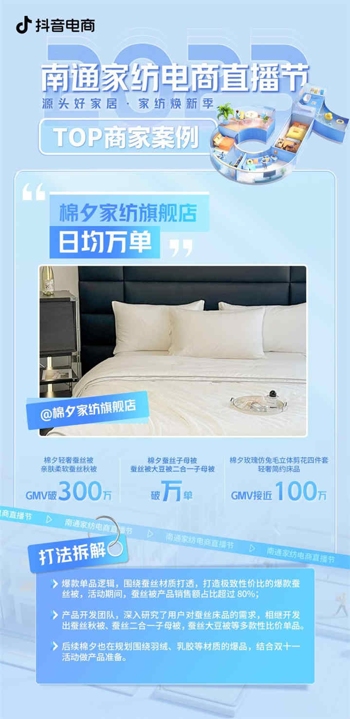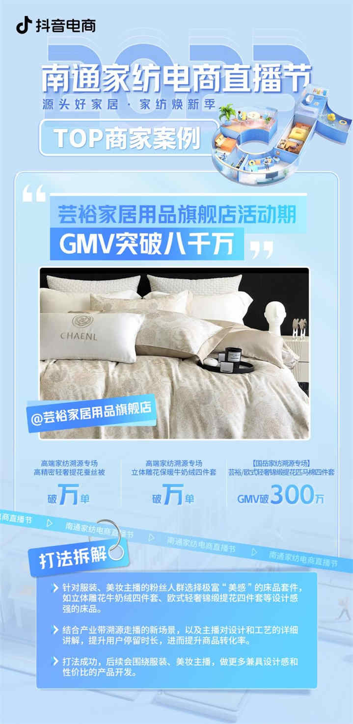 這是抖音電商助力源頭好物出圈、推動產業帶商家發展的又一次成功嘗試。從長遠來看,“源頭好家居”這一行業心智IP,不僅僅幫助南通家紡產業帶商家走向更廣闊的市場,實現生意破局增長,也助推南通家紡產業帶打造出鮮明的城市名片,將“南通”和“優質紡織產品”畫上等號,形成穩定的消費認知,從而有效推動地方產業帶商家的升級發展。