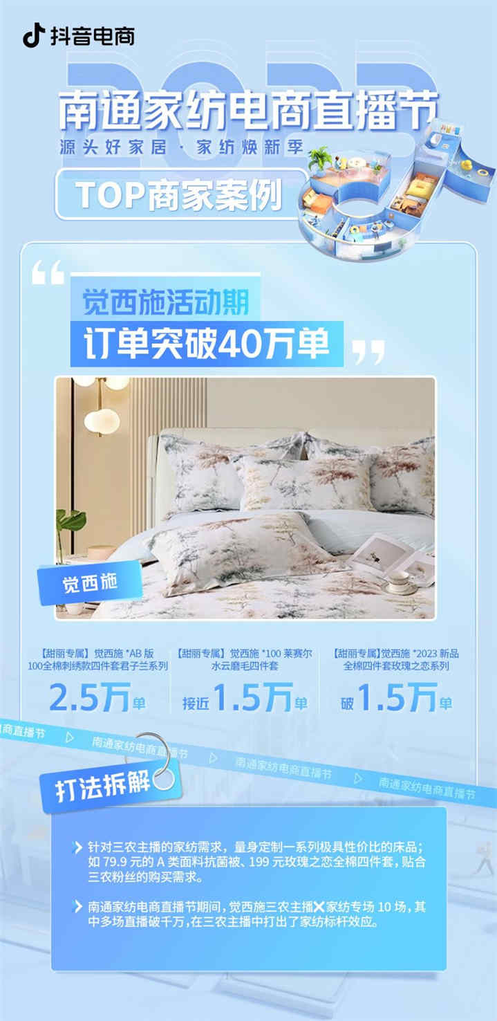 商家覺西施則針對三農主播的粉絲群體高價格敏感度的特點,為其量身定制出一系列極具性價比的床品,例如79.9元的A類面料抗菌被、199元玫瑰之戀全棉四件套,主動貼合用戶消費習慣,以低價好物激發用戶購買欲望。活動期間,覺西施訂單突破40萬單,多個家紡直播專場破千萬,成為南通家紡產業帶的標桿商家。