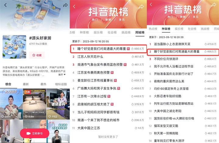 為了進一步放大活動聲量,此次活動推出了#源頭好家居、#家紡換新季、#睡個好覺是我們對南通最大的尊重 等多個話題,鼓勵商家、達人及用戶輸出家紡產品相關優質內容。其中,話題# 睡個好覺是我們對南通最大的尊重 登上同城榜TOP1,種草榜TOP2,初步構建起家紡產品與南通產地的聯想心智。