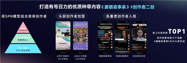 第二,要打造有號(hào)召力的優(yōu)質(zhì)種草熱點(diǎn),創(chuàng)作者二創(chuàng)是突破圈層的關(guān)鍵營(yíng)銷方式。在選擇創(chuàng)作者時(shí)可使用SPN模型,組合邀請(qǐng)創(chuàng)作者共創(chuàng)。比如《唐朝詭事錄》邀請(qǐng)頭部影視創(chuàng)作者加盟,并采用各垂類創(chuàng)作者入局模式,充分解讀劇集的種種細(xì)節(jié),助推話題 #唐朝詭事錄為什么受歡迎 登上抖音熱榜TOP1。