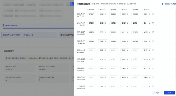 在投放過程中,品牌還可以在【預算分配參數設置】里,根據實際生意情況進行關鍵拆解指標的調參,以蓄水期為例,A1-A3X各觸點的貢獻占比,以及對應的維持系數均可進行個性化調整,保持營銷的靈活性。