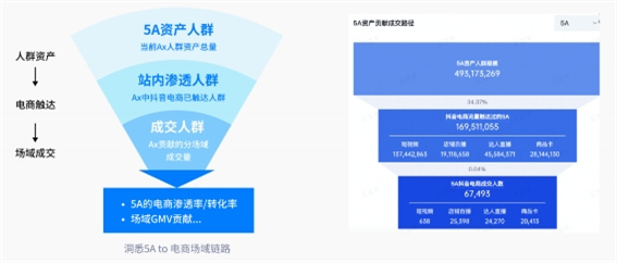 ? 在經營場,品牌可以通過巨量云圖5A成交路徑分析,分別針對已滲透和未滲透的5A人群輸出差異化策略,促進5A到電商滲透、再到成交的流轉,從而提升5A的電商經營效能;