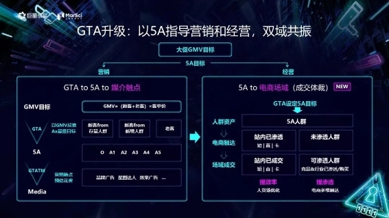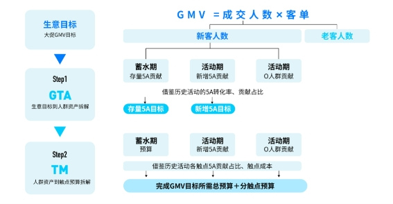 大促期間,許多品牌可能投入大量媒介資源,但未必能夠實現預期的GMV目標。通過GTATM(GMVto5AtoMedia),品牌可以一開始就設定好GMV目標,將其拆解為5A人群在蓄水期和活動期的需求數量,從而更精確地規劃媒介資源和投放策略,提高大促效果的確定性。