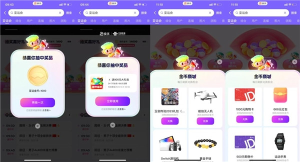 關(guān)于金幣的使用,快手也提供了多種玩法。在獲得一定數(shù)量的金幣后,用戶便可參與抽獎(jiǎng),隨機(jī)抽取金幣、品牌卡券等福利;還可以前往“金幣商城”,直接使用金幣兌換豐厚好禮,不僅有亞運(yùn)吉祥物手辦盲盒,亞運(yùn)吉祥物玩具、亞運(yùn)會(huì)吉祥物鑰匙扣等,還有游戲皮膚套裝、游戲禮包以及游戲機(jī)、運(yùn)動(dòng)手表、無人機(jī)等實(shí)物大獎(jiǎng)(以金幣商城中當(dāng)前顯示獎(jiǎng)品信息為準(zhǔn)),數(shù)量有限,先到先得!