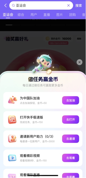即日起至10月8日,用戶登錄快手APP或快手極速版APP進(jìn)入【亞運(yùn)會(huì)】主頁(yè)面,即可參與【贏金幣換好禮】活動(dòng)。為了更好地與亞運(yùn)賽事結(jié)合,活動(dòng)期間,中國(guó)隊(duì)每獲得一枚金牌,用戶即可領(lǐng)取相應(yīng)的金幣獎(jiǎng)勵(lì),共同慶祝中國(guó)奪金時(shí)刻!與此同時(shí),用戶每天還可以通過任務(wù)解鎖贏取更多金幣,為中國(guó)隊(duì)加油、觀看精彩視頻、觀看精彩直播、關(guān)注亞運(yùn)相關(guān)賬號(hào)、預(yù)約亞運(yùn)精彩直播等等,完成以上任務(wù)均可獲得相應(yīng)數(shù)量的金幣,讓用戶邊看精彩亞運(yùn)賽事邊解鎖金幣福利。