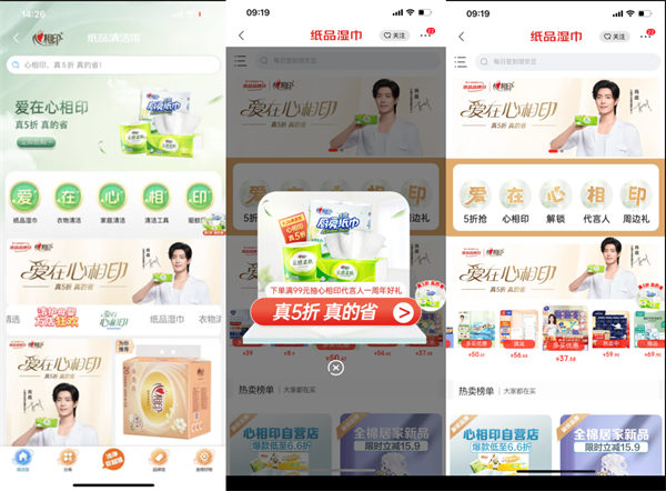 此外,心相印為貫徹京東家清“真5折”心智,通過店鋪KV、微博、京東開屏、京東首頁等資源進行宣導,為會場真5折貨品引流,實現“真5折”長線心智種草。