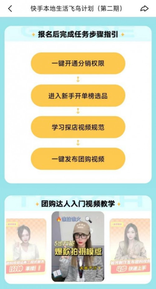 值得關(guān)注的是,本次“飛鳥計劃”開辟出更多樣的活動玩法,提供新手任務(wù)、新星任務(wù)、出道任務(wù)等不同階段任務(wù),達人按照要求帶話題#飛鳥計劃 發(fā)布帶團購商品視頻,完成任務(wù),即可不斷進階,獲得更多獎勵。