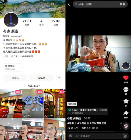 利用“飛鳥計劃”的高質(zhì)量貨盤及流量、現(xiàn)金扶持,團購達人@有點謙強 也在計劃期內(nèi)收獲高速成長躍遷。“快手的本地生活處于起步期,競爭相對小,流量扶持大,并且快手的補貼價格力度也更強。”