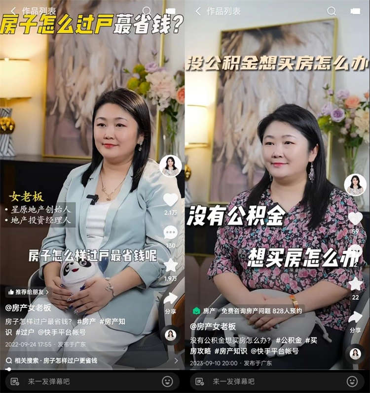 令盧文清沒想到的是,在多個平臺賬號賽馬中,快手賬號率先起量,脫穎而出。“‘房產女老板’的賬號沒投一分錢,就漲了2.3萬的粉絲。”