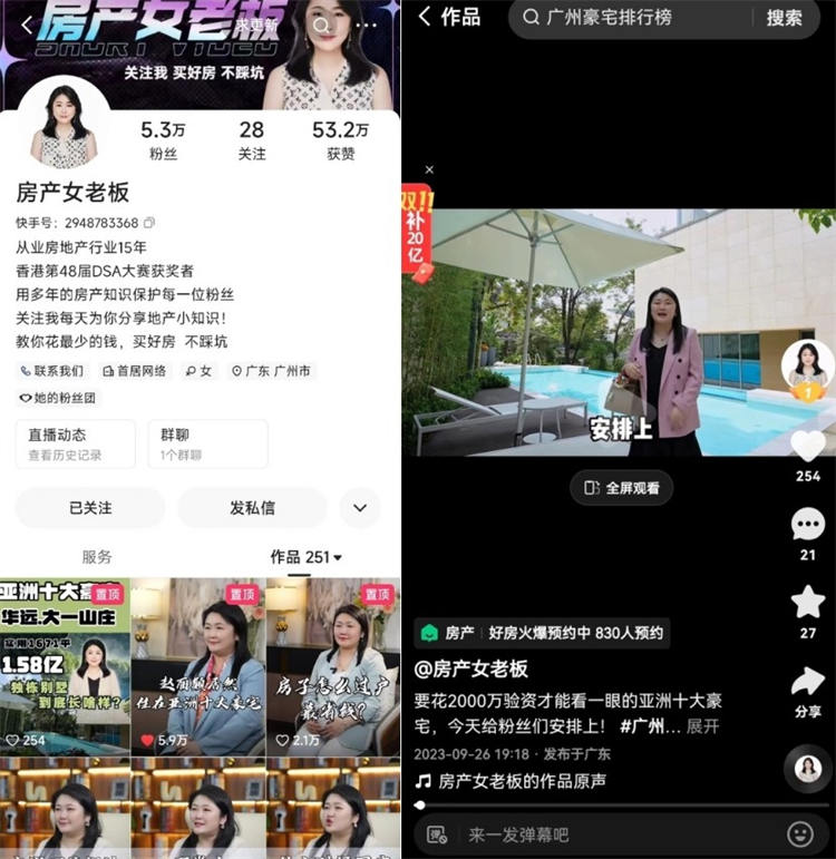 “在珠三角地區,快手的直播賣房真的行得通嗎?賬號流量效果向好,后續真的會有可觀的生意轉化嗎?”2022年底,廣州房產主播“房產女老板”(快手ID:2948783368)盧文清在快手運營了大半年,粉絲量就超過了2.3萬,即便心里藏著不少對快手房產生意轉化的疑慮,但盧文清依舊堅持對快手運營下功夫。