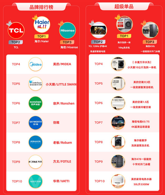 從品牌來看,傳統優勢國貨受到消費者青睞,海爾、TCL、海信成為尾款期間大家電類目領頭羊,美的、小天鵝、容聲等品牌也榮登品牌成交TOP10排行榜。在品牌效應與優質產品的雙重驅動下,海爾洗烘一體洗衣機、TCL智能電視、海信一級能效對開門冰箱等產品成為本次活動的超級單品。