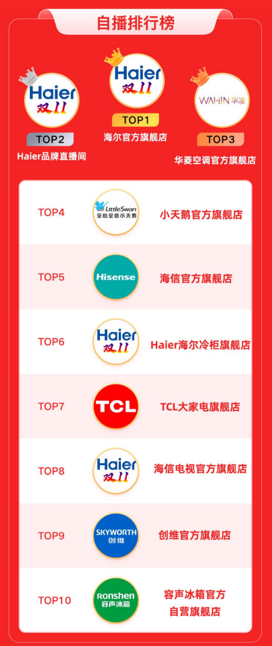 不少大家電品牌也在此次雙11發力自播,海爾官方旗艦店、Haier品牌直播間、華菱空調官方旗艦店等自播直播間銷量亮眼,登上自播排行榜,同時也為此后長效經營打好基礎。