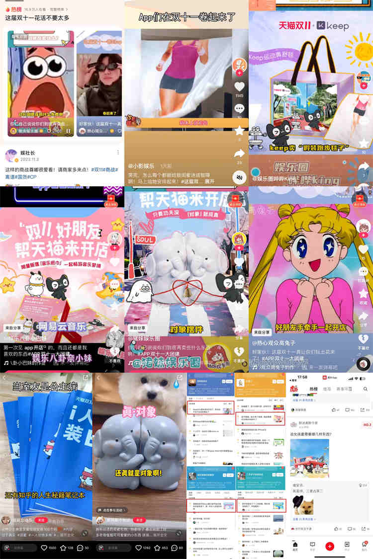 除合作平臺主動推廣造勢之外,此次跨世紀合作事件,還在抖音、快手、小紅書,乃至豆瓣和虎撲上引起熱議,成功卷入各圈層用戶群體。各領域達人圍繞天貓聯動產品及事件進行腦洞創作,多個爆款作品走紅,引發#這屆雙十一花活不要太多 熱榜話題討論。