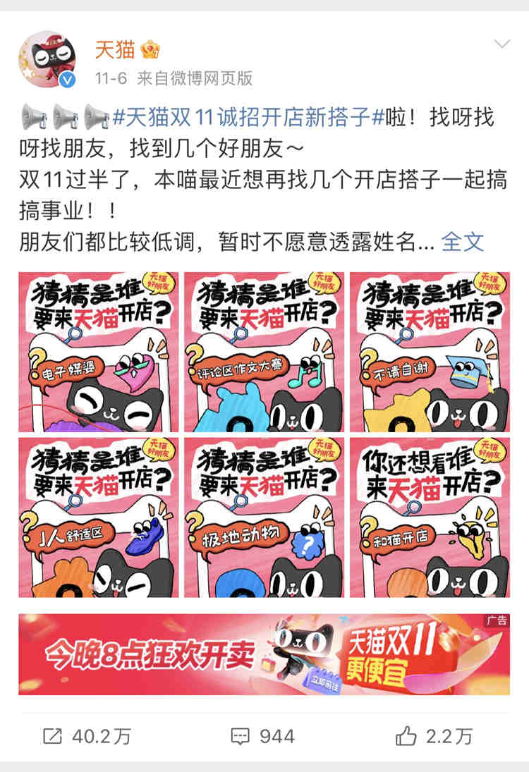 隨著11月7日陸續官宣,#天貓雙11誠招開店新搭子#、#雙11好朋友幫天貓來開店# 等線上話題的持續擴散,進一步拉動了泛娛樂圈層的廣泛關注和討論,這次意想不到的破次元聯動,充分展現了天貓在雙11的主場地位。