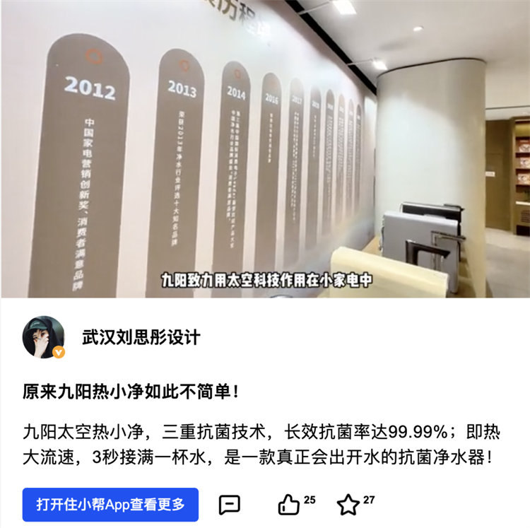 擁有專業能力與信任背書的家裝設計師們,是九陽溝通目標用戶的高效切入口。住小幫與九陽聯動參訪的@杭州中石、@錦哉、@彌高設計、@深白設計 等8位設計師,在抖音、住小幫、小紅書、好好住、今日頭條等多個平臺發布熱小凈產品種草視頻,廣覆蓋家居家裝圈層用戶,設計們也通過結合產品特點與家裝設計方案,展示九陽產品帶給屋主的真實生活加分體驗,為用戶提供決策參考。