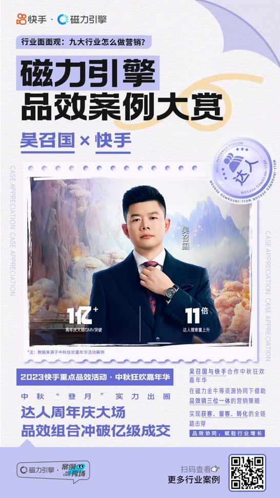 快手達人“吳召國”的案例是達人營銷品類的一個典型,以“周年慶”為契機,合作“中秋狂歡嘉年華”行業活動,直播前充分預熱,構建直播售賣大場,直播開始后量身定制磁力金牛的有效投放策略,抬升自然流量,結合超強利潤款選品,拉升凈利潤。品效資源整合共同助力直播間人氣升溫,推動GMV總數破億,達到新高峰,最總實現了曝光和銷量的雙效提升。