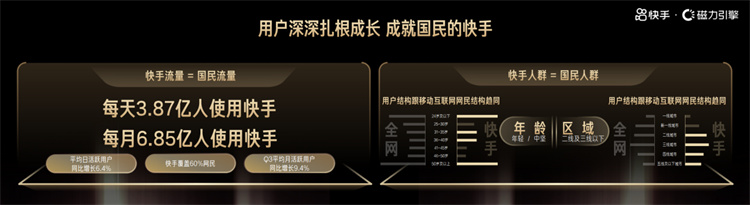 作為平均日活高達3.87億的頭部短視頻直播平臺,快手在“全民刷屏”時代展現出巨大的商業價值,也為品牌布局新營銷,尋找確定性增長提供了核心助力。據孫匯灃介紹,全中國每月有6.85億人活躍在快手,覆蓋超60%的網民。今年第三季度平均月活躍用戶同比增長9.4%。更值得一提的是,快手用戶結構與移動互聯網網民結構呈現趨同的現象。