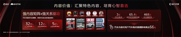 從創作者維度來看,“達人”們多元且豐富,既有流量王者、也有細分領域玩家、還有汽車媒體人以及特色汽車人,這為汽車品牌構建以達人為核心的營銷路徑提供了豐富的拓展空間。某種程度上來說,這正是快手汽車內容生態能源源不斷的挖掘商業價值的原因所在。而快手平臺“老鐵文化”的基因,依托于新線城市的高滲透率,已將其本身打造成一個“實在人、實在貨、實在價”的平臺。這樣的生態剛好能夠讓汽車品牌方通過平臺上的32萬活躍的汽車內容創作者和其中的內容達人,以短視頻播放量超15億、直播間超5億的曝光量覆蓋潛在目標客戶,從而形成“圈粉”的連接。