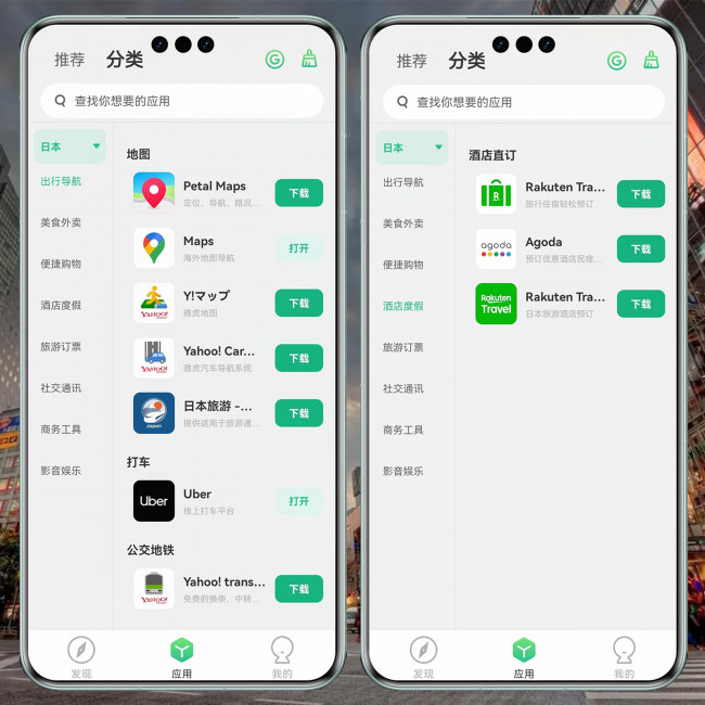 下載好常用的應用外,咱們出行海外,可能特定國家還會有當地常用的一些小眾APP,如果不知道下載哪些得話,還可以通過出境易的分類應用下的國家地區推薦來下載,例如年底計劃去日本北海道旅行得話,就可以通過推薦下載日本地區常用的地圖軟件Yahoo地圖,坐地鐵常用的換乘案內,和社交聊天常用的LINE以及預訂民宿時常用的樂天旅行等應用,下載好后落地日本即可打開使用,方便又省心。