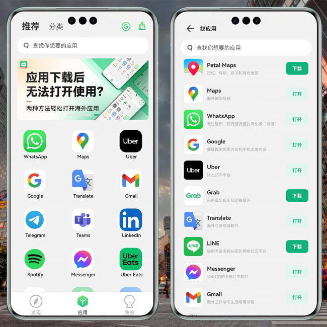 出境易是一款海外出行必備APP,不管是華為手機系統還是安卓手機系統有無谷歌框架的都可以直接在應用內下載谷歌商店上架的應用,例如全球通用的寶藏地圖軟件Google Maps、海外通訊和聊天常用的whatsApp、跟國外友人交流溝通會用到的翻譯軟件Translate還有娛樂社交分享常用的Instagram和Twitter都可以直接下載到手機。