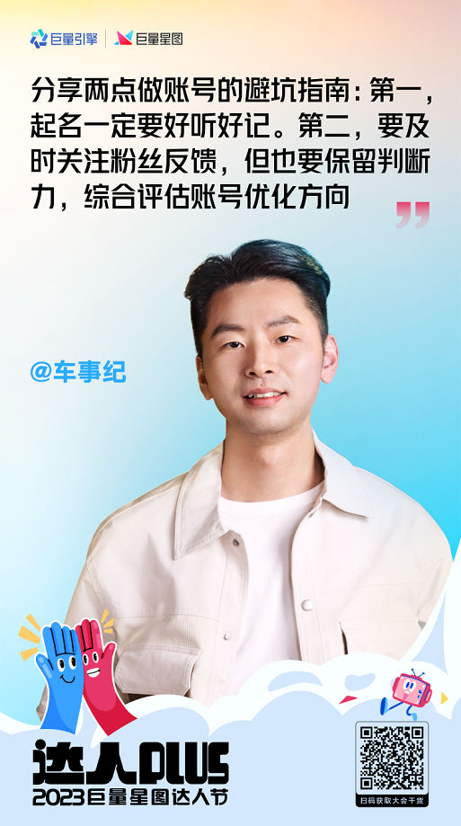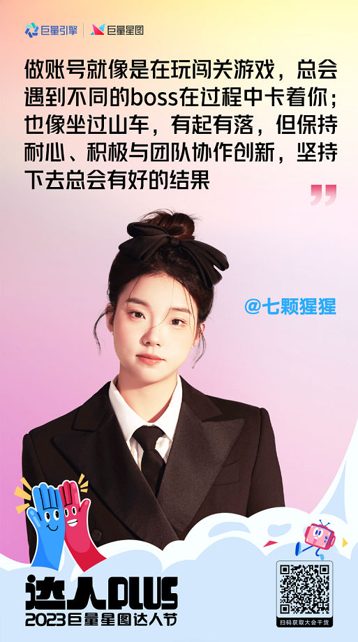 如今,越來(lái)越多的創(chuàng)作者選擇達(dá)人這份事業(yè),并為熱愛(ài)而努力著。本次巨量星圖達(dá)人節(jié)上,王七葉、車(chē)事紀(jì)、大能、七顆猩猩、放揚(yáng)的心心等達(dá)人,共同圍繞賬號(hào)成長(zhǎng)如何突破瓶頸期、內(nèi)容和商業(yè)化如何平衡等話(huà)題,分享了他們的“成長(zhǎng)心得”和“避坑指南”。