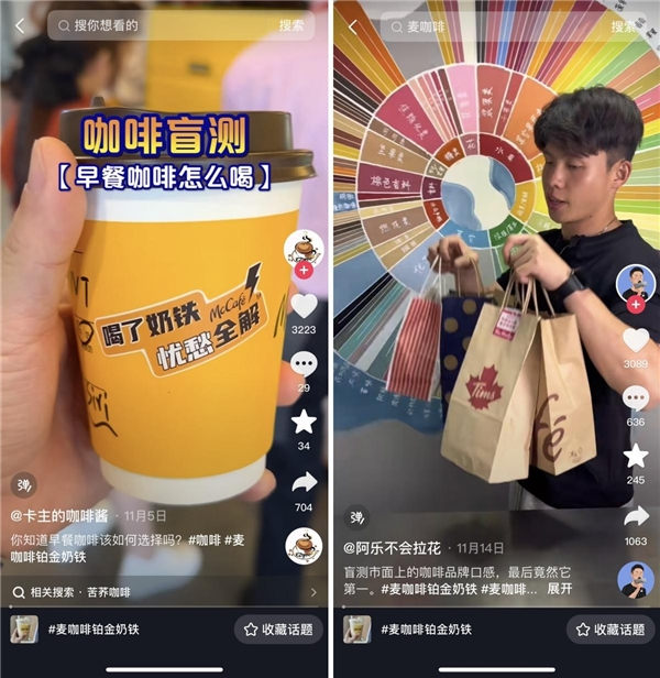 話題之下,@卡主的咖啡醬 分享了適配早餐咖啡的盲測視頻,軟性植入產品的亮點。@阿樂不會拉花 也邀請朋友一起測評市面上的咖啡品類,通過趣味的互動釋放麥咖啡的優勢。在官方話題的熱度及多種重磅玩法的帶動下,活動吸引多元達人參與,充分調動用戶打榜積極性,為推高麥咖啡新品營銷熱度奠定了基礎。
