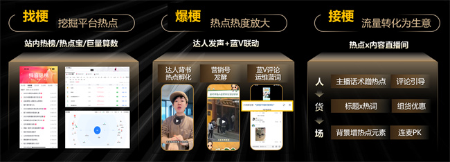 除了短劇,抖音上的熱點(diǎn)營(yíng)銷也能快速幫助品牌嶄露頭角。通過找梗、爆梗、接梗的三步走策略,日化品牌能夠事半功倍地將流量轉(zhuǎn)化為生意——首先通過站內(nèi)熱榜/熱點(diǎn)寶/巨量算數(shù)挖掘熱點(diǎn),再借助達(dá)人發(fā)聲+藍(lán)V聯(lián)動(dòng)進(jìn)行熱度放大,最后通過熱點(diǎn)與內(nèi)容直播間的結(jié)合,將流量轉(zhuǎn)化為生意。