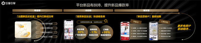 比如,籌備期,云圖新品實(shí)驗(yàn)室能提升打新成功率;冷啟期,搜索能力可以幫助新品加速,快速破首單;而爆發(fā)期,借助新品營(yíng)銷IP的重磅加推,品牌能夠?qū)崿F(xiàn)更快速的市場(chǎng)爆發(fā)。