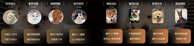 例如,剛需囤糧型寵主更傾向于通過搜索下單,富養寵愛型寵主更傾向于購買高端品牌和智能寵物用品,潮流玩咖型寵主多為年輕潮流群體中。這些洞察不僅有助于品牌更全面地了解寵主人群,還為品牌提供了定制化的營銷策略和產品推廣方案的機會。