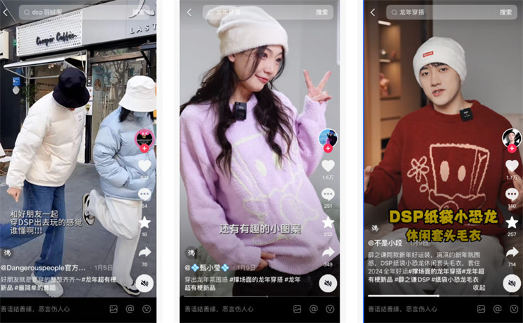其中,DSP打通全鏈路種草,邀請@甄小瑩、@不是小段等達人展現龍年新穿搭,并在短視頻中分享「DSP紙袋小恐龍休閑套頭毛衣」新品,通過優質內容營造滿滿的新年氛圍感。活動期間,隨著#撐場面的龍年穿搭 話題登上抖音熱點總榜TOP 5,DSP新品覆蓋到更多興趣用戶,通過直播加推、優惠券疊加等玩法,此款新品訂單量破1300,貨架GMV占比超過37%。