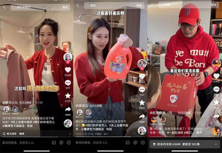 第二是“達(dá)人效應(yīng)”。此番活動也邀約包括南翔不愛吃飯、臘月小九、江尋千九月、小宇菇菇、瀟灑楊女士等眾多頭部和知名達(dá)人深度參與。有的不僅集體上鏡,與巨量引擎和新華網(wǎng)首度為品牌共創(chuàng)視頻,成為頗具眼球焦點(diǎn)的話題事件;也有的圍繞各路品牌的產(chǎn)品調(diào)性和主要功能,通過專業(yè)解讀或?qū)嶋H示范,為品牌在輸出創(chuàng)意視頻的同時(shí),也拓寬其在春節(jié)場景具體應(yīng)用與必要價(jià)值。令產(chǎn)品既能通過達(dá)人找對人,也能讓人通過達(dá)人找對產(chǎn)品。