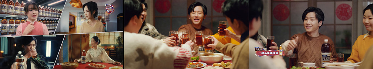 “我們的年夜范兒”的春節(jié)IP符號,也便順理成章地為品牌營銷搭建了通往受眾心智的快車道。例如巨量引擎聯(lián)合眾多達(dá)人,圍繞“三得利”共創(chuàng)了一部聚焦春節(jié)餐桌的趣味視頻,以朋友歡聚的春節(jié)需求為基底、用前后反差的生活喜劇為解構(gòu),而一個(gè)個(gè)熟人面孔——達(dá)人們從中穿針引線,共同將三得利的烏龍茶飲轉(zhuǎn)化為對春節(jié)的符號及功能載體——譬如春節(jié)時(shí)人們常常大快朵頤,而解膩的三得利就能成為餐桌的最佳搭檔;尤其餐前餐后人們常常會圍桌聊天,三得利也能針對中國人特有的待客之道,帶來兼具便捷與地道的品茶之禮。