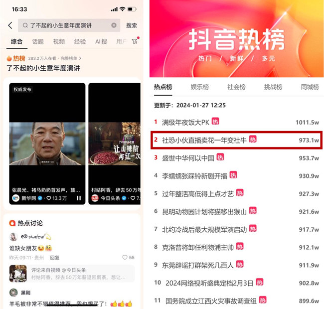 更值得注意的是,@云舍花卉 商家故事,打造#社恐小伙直播賣花一年變社牛 社會熱點事件,最終登上抖音總榜top2、社會榜top7位,今日頭條榜top9。投放干貨稿件被鈦媒體、新浪文創、首席商業評論等頭部媒體轉載。