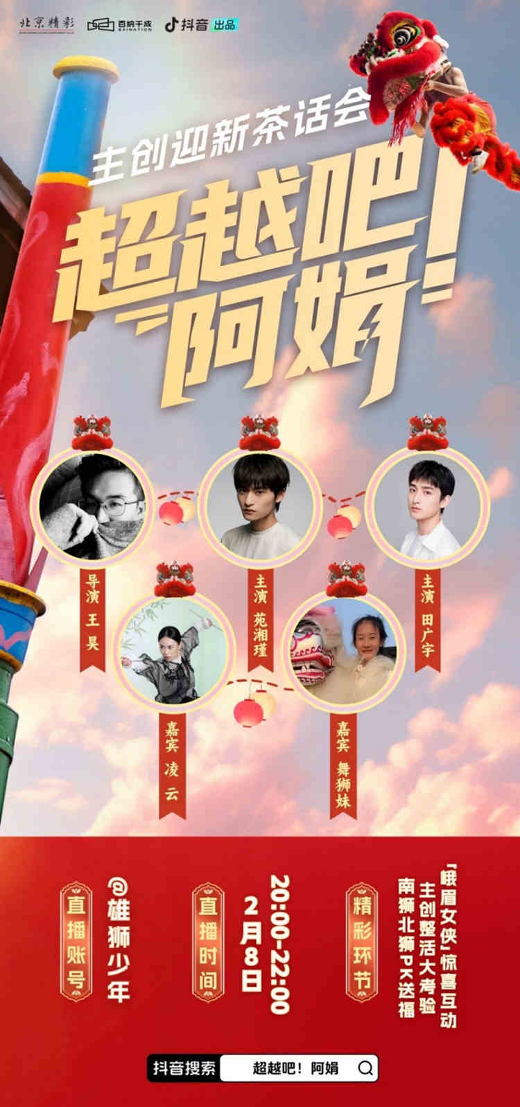為了滿足觀眾的好奇心,新春前夕,《超越吧!阿娟》將在官方抖音賬號@雄獅少年 開啟首次直播活動!直播間里,《超越吧!阿娟》導演王昊、阿娟扮演者苑湘瑾、阿樂扮演者田廣宇,將與抖音達人@舞獅妹、@凌云一同展開有趣互動,同時為廣大網友提前拜年!